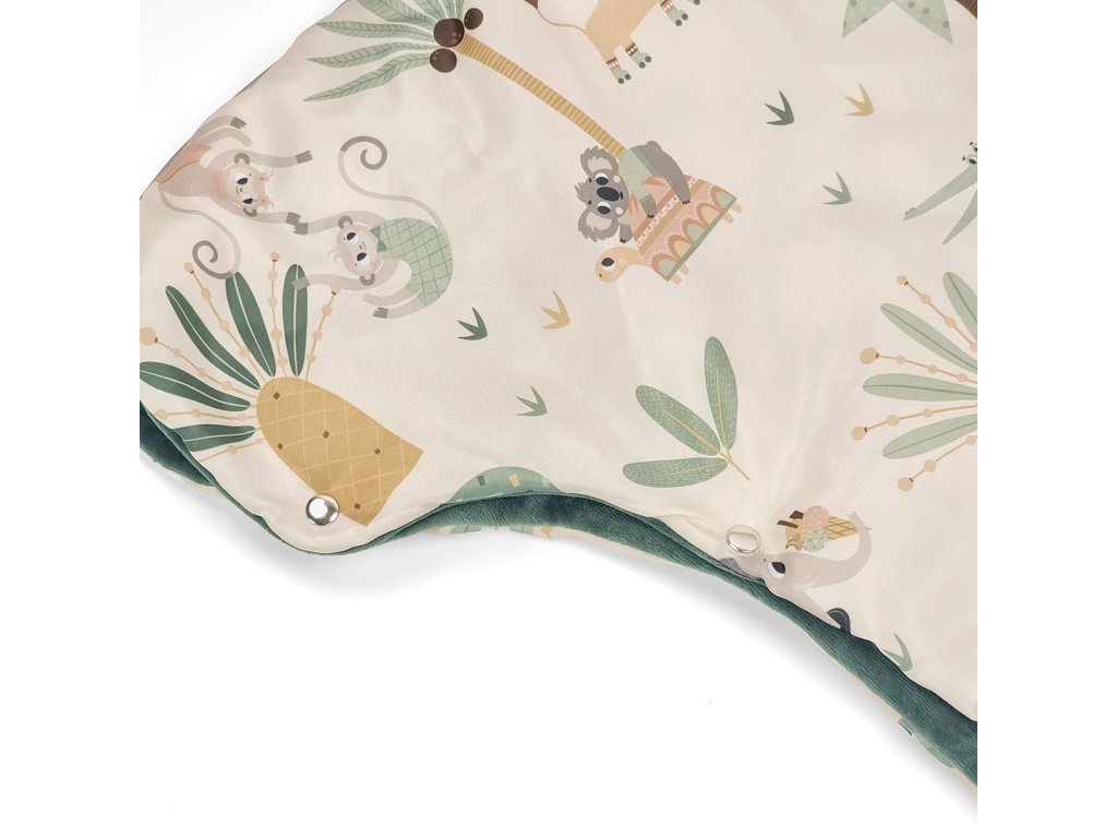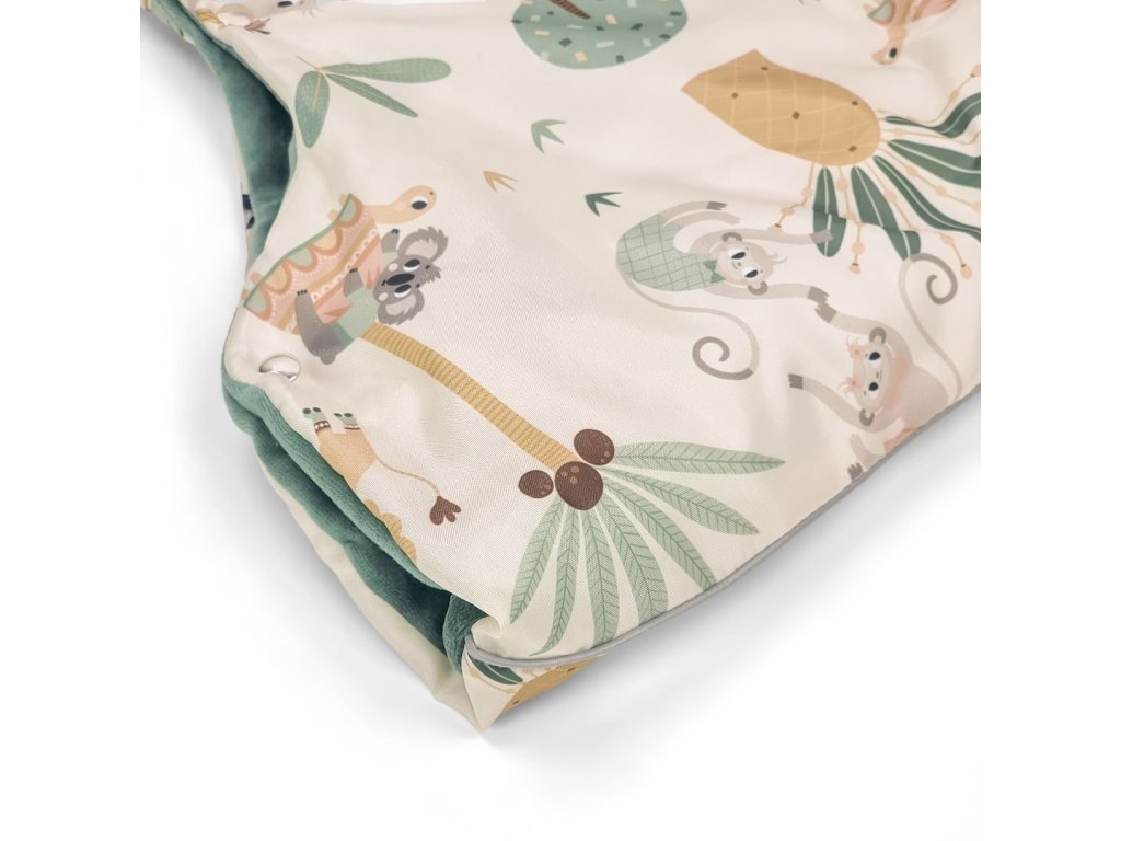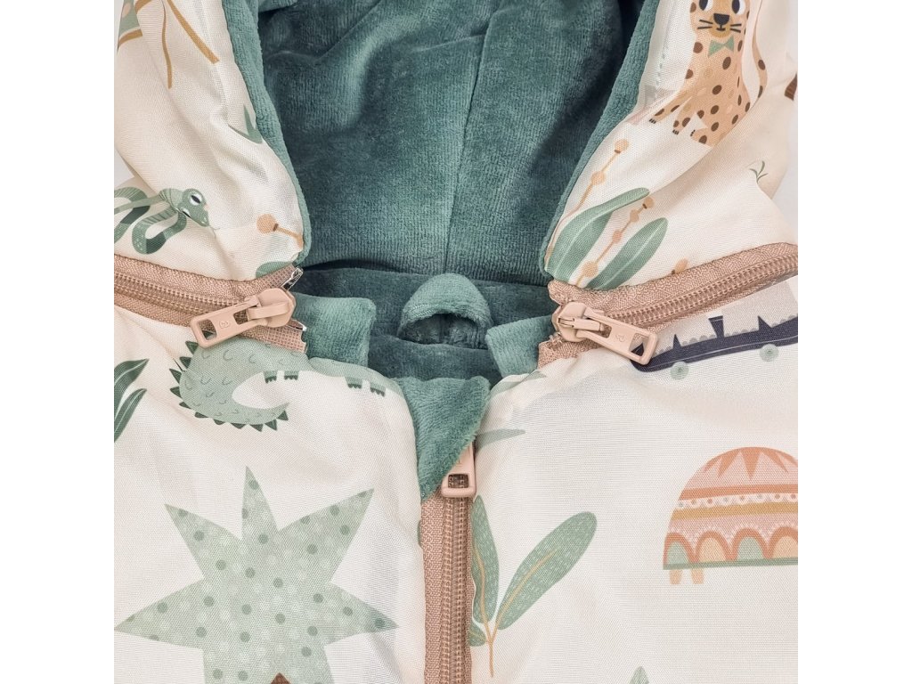 - Dvojitý zips s dvoma jazdcami (horný-dolný, dolný-horný) umožňuje ľahký prístup k bezpečnostným pásom a umožňuje ich upevniť čo najbližšie k telu dieťaťa, čo zaisťuje absolútnu bezpečnosť počas jazdy.