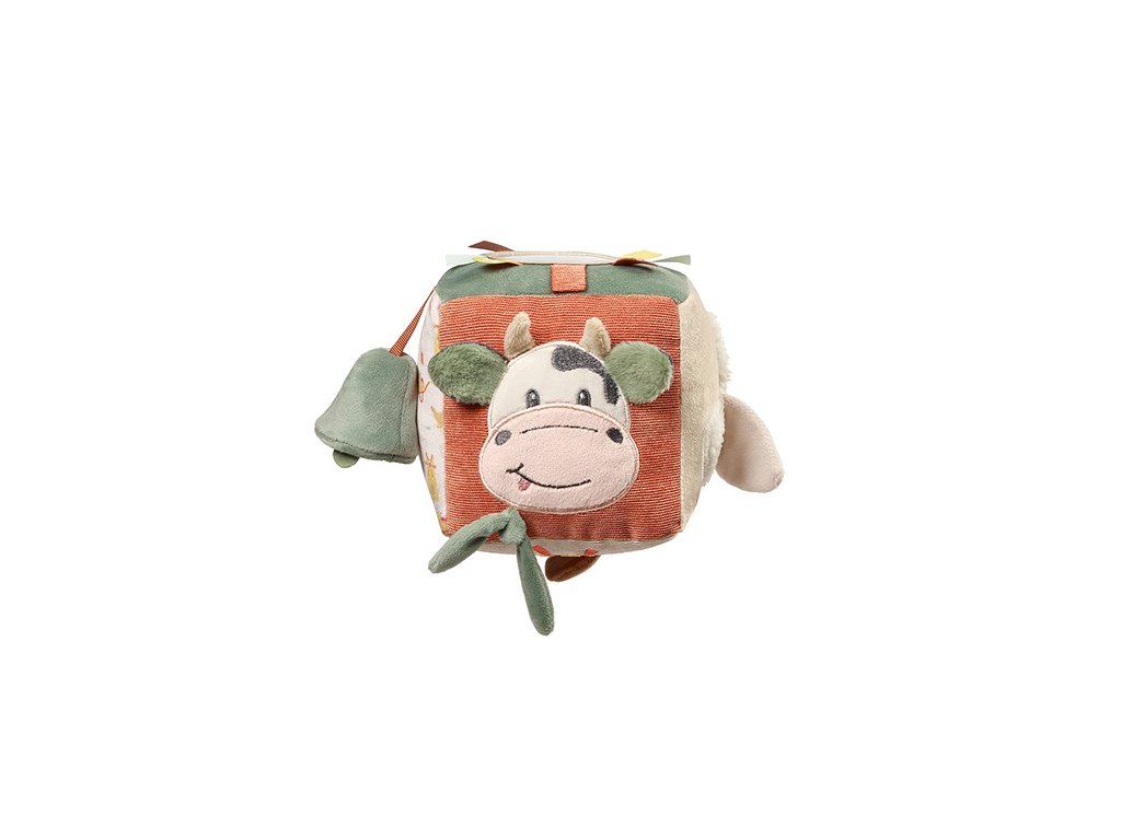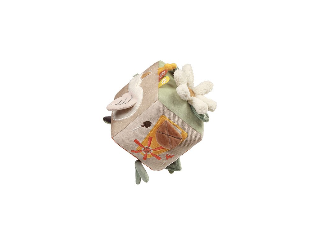 Táto kocka pre aktivity sa vyznačuje šuštiacim zvukom a jemnou hrkálkou, ktoré stimulujú sluch. Vyčnievajúce stužky a povrázky povzbudzujú k uchopeniu, zatiaľ čo bezpečné zrkadielko povzbudzuje k skúmaniu vlastného odrazu. Mäkké hryzátko jemne masíruje ďasná.