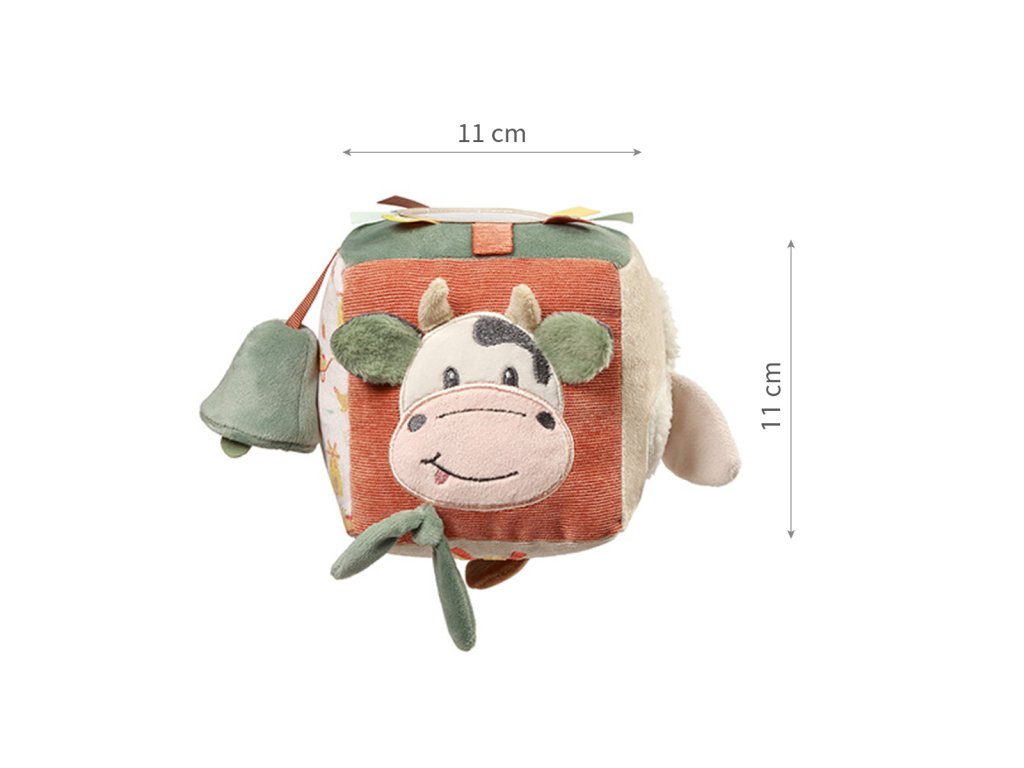 Plyšová senzorická kocka Kravička BINGO je hračka plná prekvapení pre bábätká, ktorá podnecuje ich fantáziu, zapája zmysly a pomáha rozvíjať jemnú motoriku.