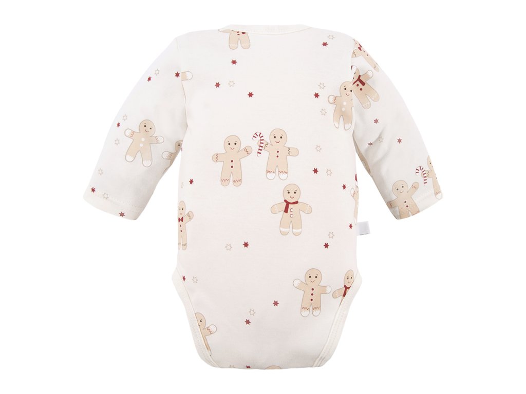 Toto ecru zavinovacie body pre bábätká s vianočnou potlačou vínových hviezdičiek a perníkov je ideálne pre novorodencov a dojčatá. Je vyrobené z mäkkej, prírodnej 100% bavlny, ktorá zaisťuje hebkosť a pohodlie od prvých dní života. Praktický zavinovací strih uľahčuje prebaľovanie a vínové lemovanie dodáva bábätku elegantný, slávnostný vzhľad.