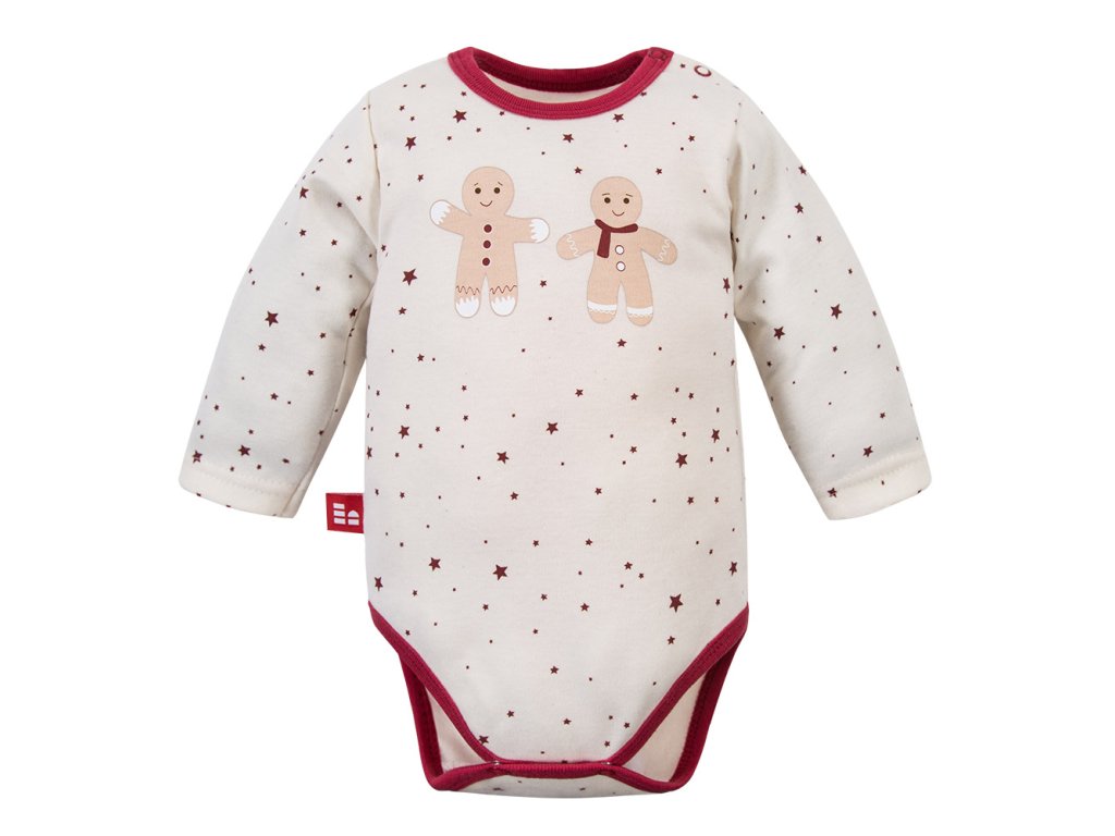 Toto ecru detské body z kolekcie My First Christmas s očarujúcou vianočnou potlačou vínových hviezd a perníčkov {/ Mäkká, prírodná 100% bavlna zaisťuje vášmu bábätku úplné pohodlie, zatiaľ čo vínové lemovanie dodáva elegantný vzhľad.