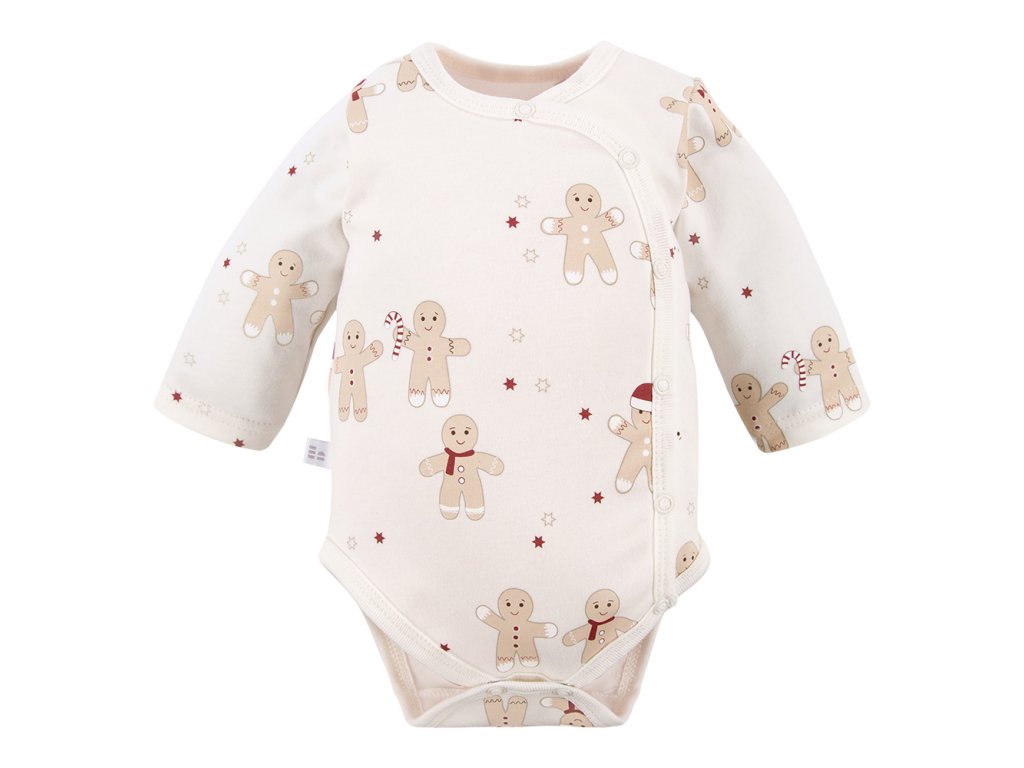 Toto ecru zavinovacie body pre bábätká s vianočnou potlačou vínových hviezdičiek a perníkov je ideálne pre novorodencov a dojčatá. Je vyrobené z mäkkej, prírodnej 100% bavlny, ktorá zaisťuje hebkosť a pohodlie od prvých dní života. Praktický zavinovací strih uľahčuje prebaľovanie a vínové lemovanie dodáva bábätku elegantný, slávnostný vzhľad.