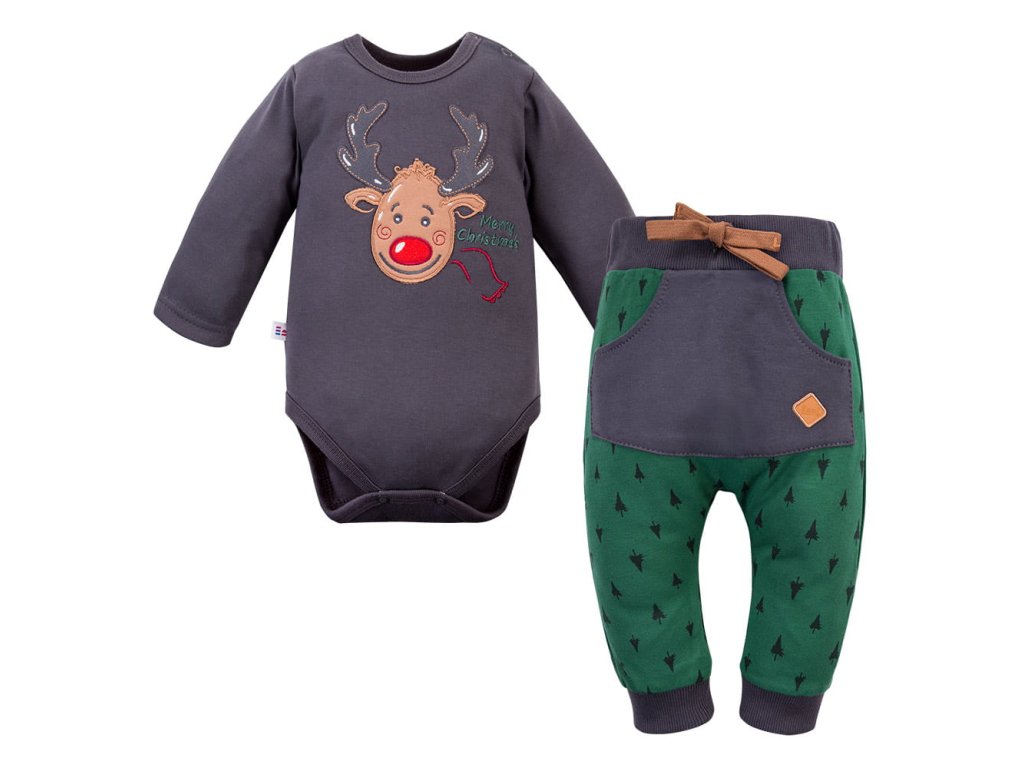 Očarujúca vianočná súprava pre najmenších z kolekcie "Hi Reindeer", vyrobená z mäkkej a jemnej bavlny, ktorá je šetrná k detskej pokožke. Súprava sa skladá z body zdobeného slávnostnou výšivkou a pohodlných nohavíc, ktoré vytvárajú harmonický a jedinečný vzhľad. Je to perfektná voľba pre rodinné stretnutia, slávnostné fotenie a čarovné zimné dni.