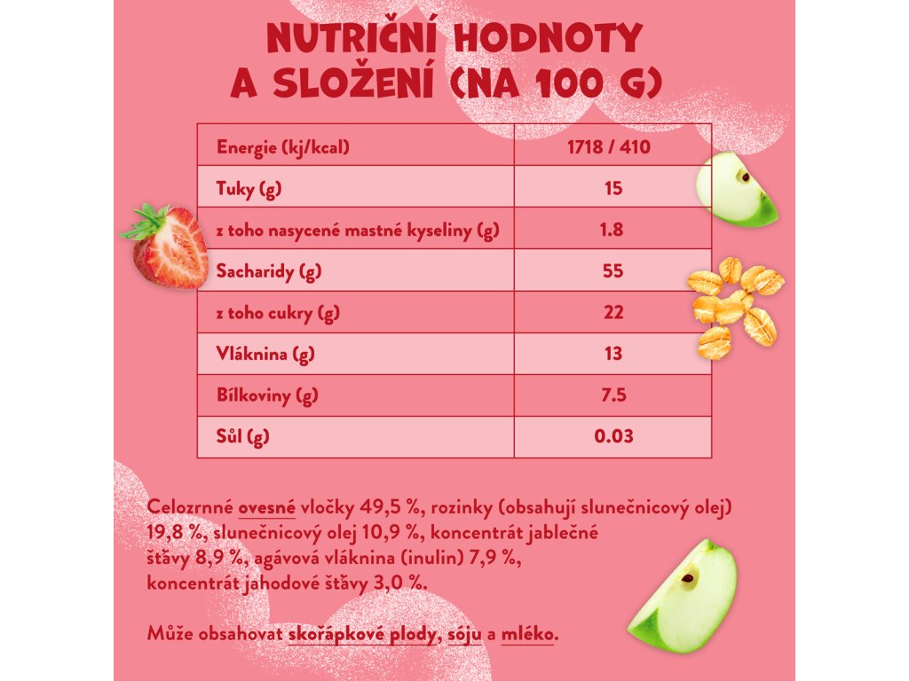 Zloženie: celozrnné ovsené vločky 49,5 %, hrozienka (obsahujúce slnečnicový olej) 19,8 %, slnečnicový olej 10,9 %, koncentrát jablkovej šťavy 8,9 %, agávová vláknina (inulín) 7,9 %, koncentrát jahodovej šťavy 3,0 %. Môže obsahovať orechy, sóju a mlieko.