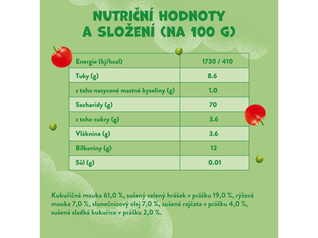 Zloženie : kukuričná múka 61,0 %, sušený zelený hrášok 19,0 %, ryžová múka 7,0 %, slnečnicový olej 7,0 %, sušené paradajky 4,0 %, sušená kukurica 2,0 %.