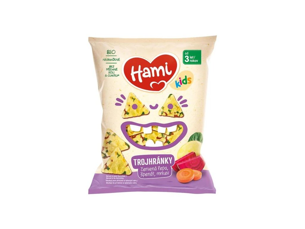 Hami Trojhránky s červenou repou, špenátom a mrkvou sú veselou a chutnou BIO desiatkou pre deti od 3 rokov, ktorá ponúka zdravšiu alternatívu klasických lupienkov. Vďaka nevyprážané úprave a prirodzene sladkej chuti koreňovej zeleniny sú ideálnou voľbou na hravé maškrtenie bez výčitiek – doma, v škôlke aj na výlete. Chrumkavé trojhránky majú príjemnú štruktúru a obsahujú iba prirodzene sa vyskytujúce cukry, bez pridanej soli.