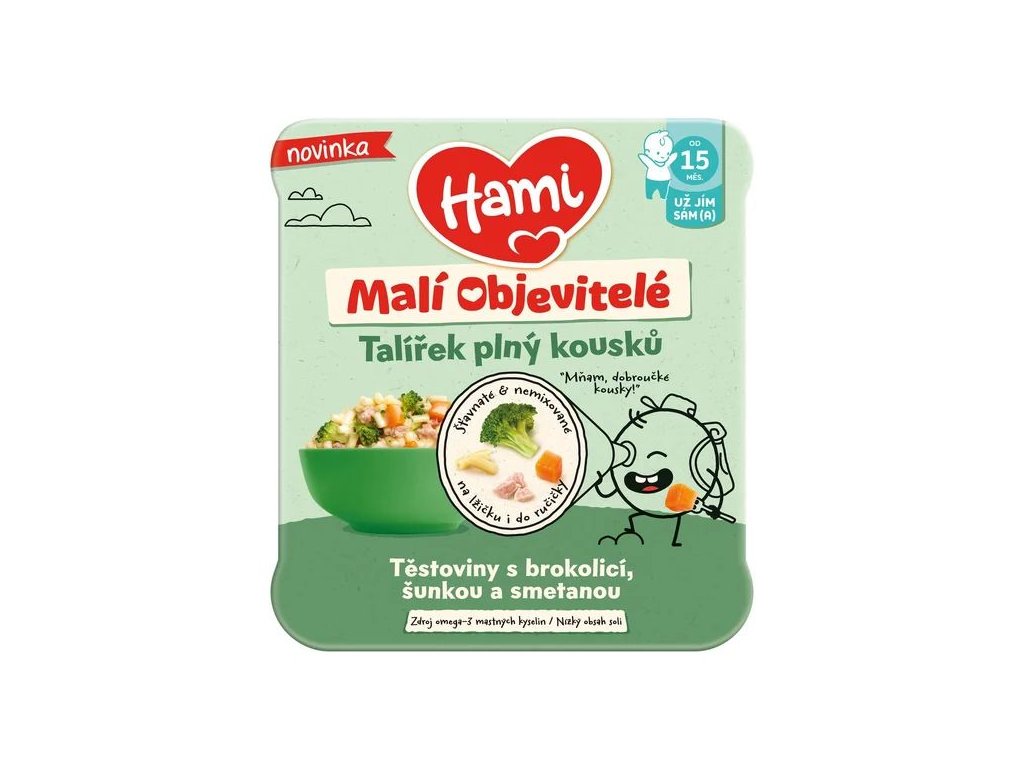 Prichádza revolúcia v radoch detských hotových príkrmov! Hami Malí objavitelia Cestoviny s brokolicou, šunkou a smotanou sú chutným a výživným obedom či večerou pre deti od ukončeného 15. mesiaca, ktoré sa učia jesť samé a objavujú nové chute. Tanierik plný mäkkých kúskov cestovín, jemnej brokolice a kvalitnej šunky je navrhnutý tak, aby podporil samostatné stravovanie a prirodzený vývoj stravovacích návykov. Zelenina je pripravená šetrným varením v pare, pokrm obsahuje len nízke množstvo soli a zároveň je zdrojom cenných omega-3 mastných kyselín. Ideálna voľba pre malých jedákov, ktorí chcú „jesť ako dospelí“ – lyžičkou aj ručičkami.