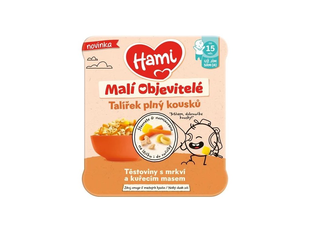 Prichádza revolúcia v radoch detských hotových príkrmov! Hami Malí objavitelia Cestoviny s mrkvou a kuracím mäsom sú chutným a výživným obedom či večerou pre deti od ukončeného 15. mesiaca, ktoré sa učia jesť samé a objavujú nové chute. Tanierik plný mäkkých kúskov cestovín, jemnej mrkvy a kvalitného kuracieho mäsa je navrhnutý tak, aby podporil samostatné stravovanie a prirodzený vývoj stravovacích návykov. Zelenina je pripravená šetrným varením v pare, pokrm obsahuje len nízke množstvo soli a zároveň je zdrojom cenných omega-3 mastných kyselín. Ideálna voľba pre malých jedákov, ktorí chcú „jesť ako dospelí“ – lyžičkou aj ručičkami.