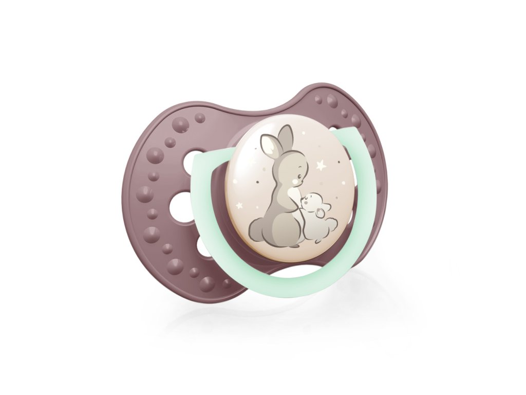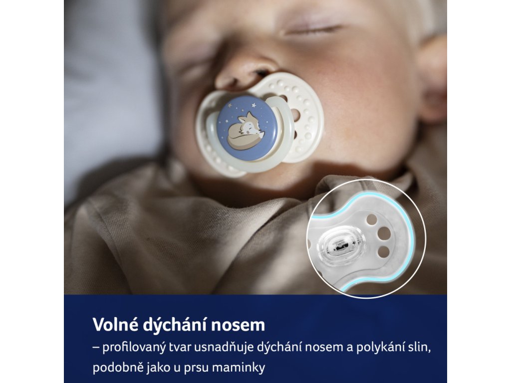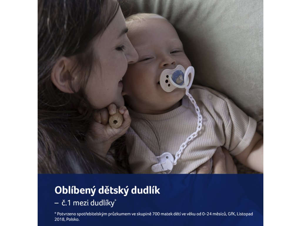 Umožňuje dieťaťu voľne dýchať nosom. Je vyrobený z bezpečného materiálu, ktorý neobsahuje BPA. Jedinečný okraj štítku je vyrobený zo zdravotníckeho materiálu, je príjemný na dotyk a zabraňuje otlačeniu cumlíka.