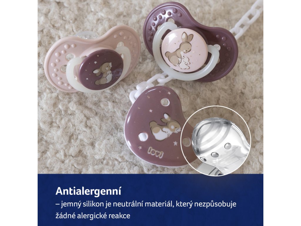 Silikónový dynamický cumlík LOVI® navrhnutý s pomocou neurológov. Jedinečný dizajn: heterogénny silikón a symetrický tvar inšpirovaný bradavkou. Nenarušuje sací reflex a prirodzený vývoj reči a zhryzu bábätka*.