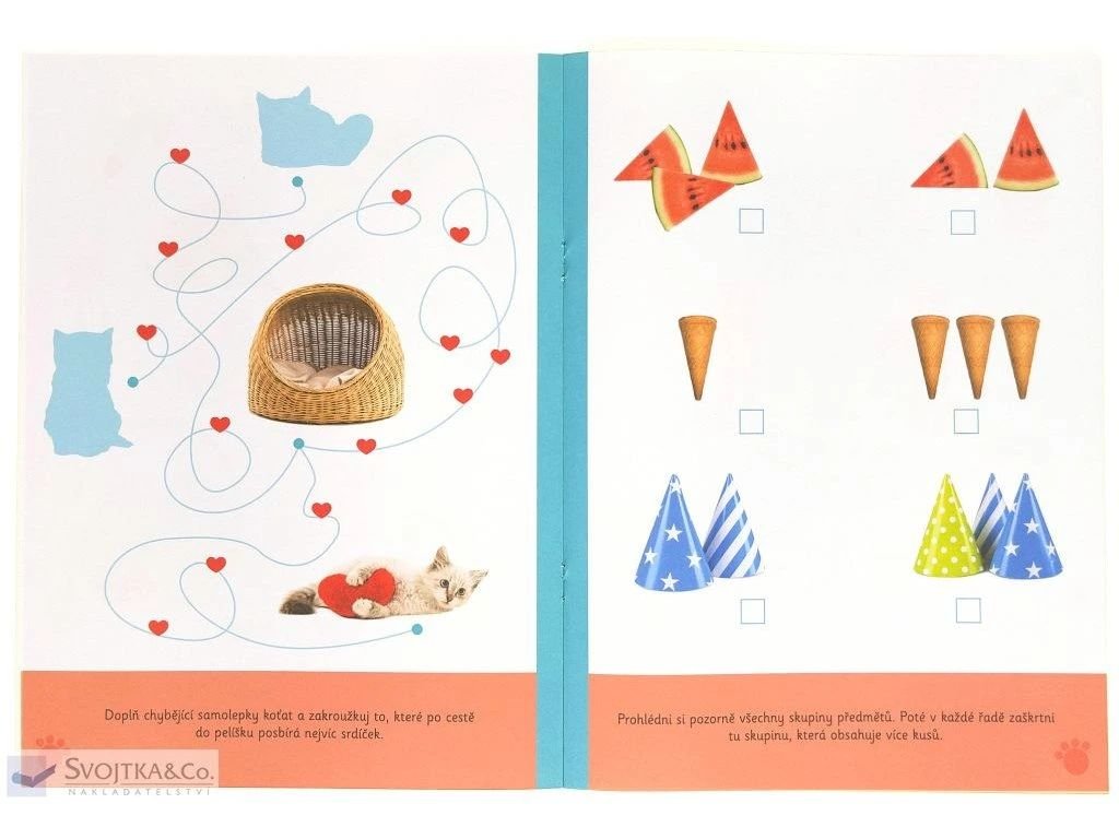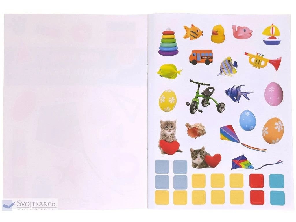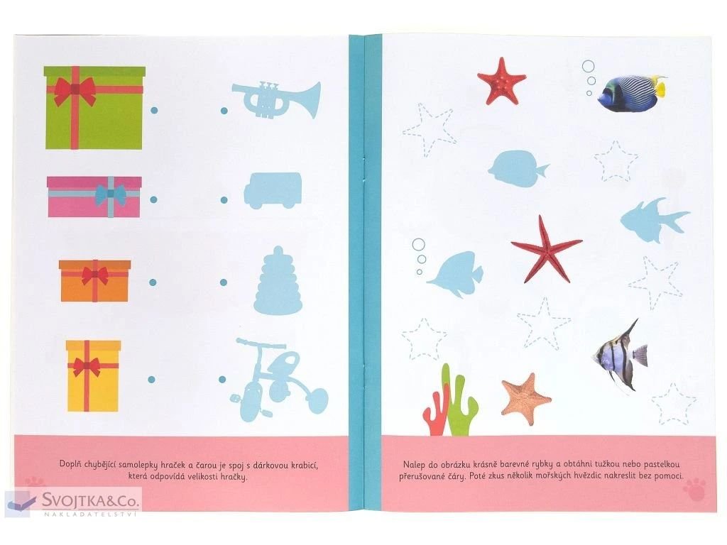- Zošit obsahuje cvičenia na vyfarbovanie, dolepovanie veselých samolepiek a obtahovanie čiar.