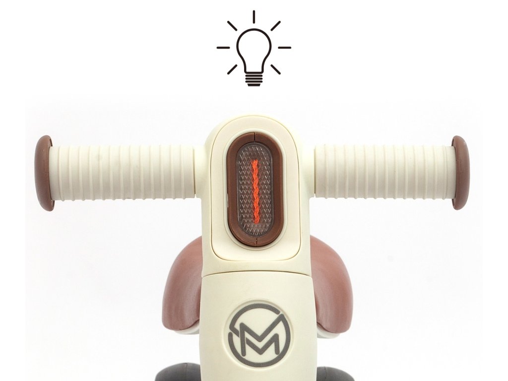 Pohodlné, tvarované sedadlo zaisťuje pohodlie aj pri dlhšej hre, zatiaľ čo mäkké rukoväte riadidiel, navrhnuté pre detské ručičky, zaisťujú bezpečný úchop. Ďalším lákadlom je LED svetlo zabudované do riadidiel, ktoré nielen priťahuje pozornosť dieťaťa, ale tiež zvyšuje viditeľnosť počas hry, a to ako vo vnútri, tak vonku, vďaka čomu je jazda ešte pútavejšia a bezpečnejšia.