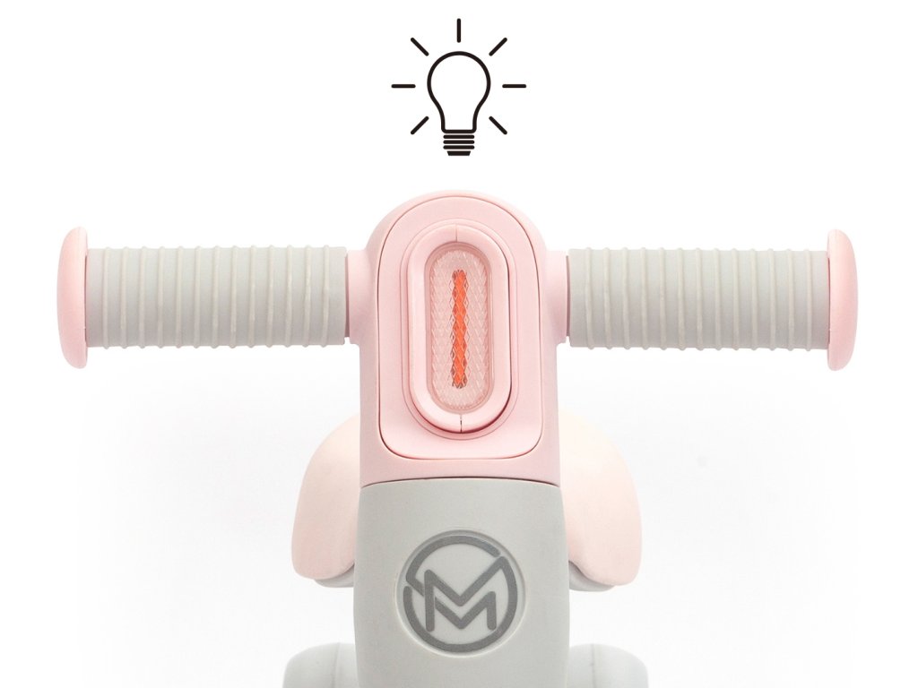 Pohodlné, tvarované sedadlo zaisťuje pohodlie aj pri dlhšej hre, zatiaľ čo mäkké rukoväte riadidiel, navrhnuté pre detské ručičky, zaisťujú bezpečný úchop. Ďalším lákadlom je LED svetlo zabudované do riadidiel, ktoré nielen priťahuje pozornosť dieťaťa, ale tiež zvyšuje viditeľnosť počas hry, a to ako vo vnútri, tak vonku, vďaka čomu je jazda ešte pútavejšia a bezpečnejšia.