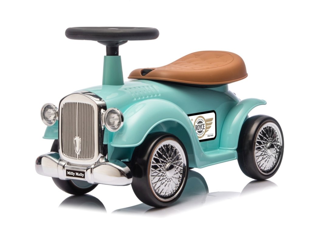 Vintige Royce Milly Mally pozýva malých cestovateľov na retro jazdu. Upúta pozornosť svojimi oku lahodiacimi farbami. Je bohato vybavený. Toto auto má volant so zvukom a tvarované sedadlo. Poskytne vášmu dieťaťu skvelú zábavu pri jazde a rozvíja jeho zmysel pre rovnováhu a všeobecné motorické zručnosti. Auto má ľahkú plastovú konštrukciu a ergonomické tvary. Otočný volant nášho jazdca Royce umožňuje náročné manévre doma aj na prechádzkach. Kolesá tohto krásneho vozidla sú vyrobené z mäkkej peny EVA. Retro autíčko môže slúžiť ako prvé vozidlo vášho dieťaťa so skutočným volantom a klaksónom, ako aj s kočíkom s otvoreným úložným priestorom na hračky (malý kufor), imitáciou palivovej nádrže na zadnej časti vozidla a prednou časťou auta - mriežkou v striebornej farbe. Logo ROYCE dodáva tomuto vozidlu estetiku a prestíž. Poslednou úpravou modelu Royce je jeho darčeková škatuľa, ktorá zachováva charakter retro vozidiel z počiatkov automobilového priemyslu. Royce je určený pre všetky deti, ktoré dokážu samostatne sedieť. Kočík sa dá používať v interiéri aj exteriéri a spríjemní vášmu dieťaťu prechádzky.