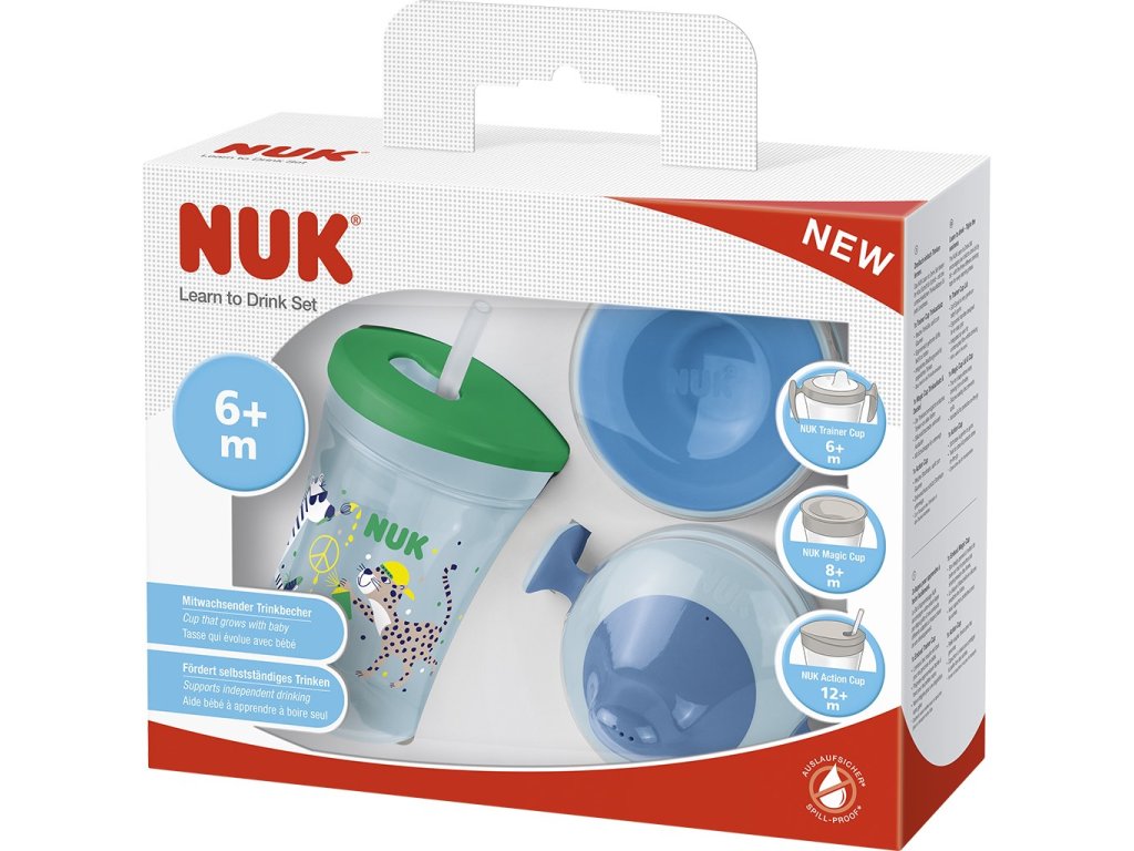 - 1x nadstavec na hrnček NUK Trainer Cup (6m+), 1x nadstavec na hrnček NUK Magic Cup (8m+), 1x nadstavec na hrnček NUK Action Cup (12m+)