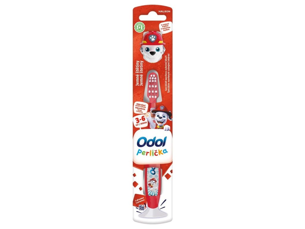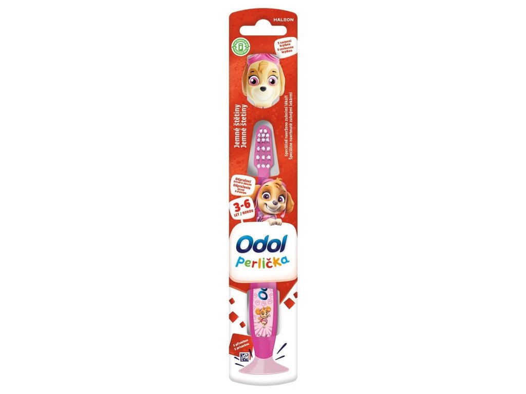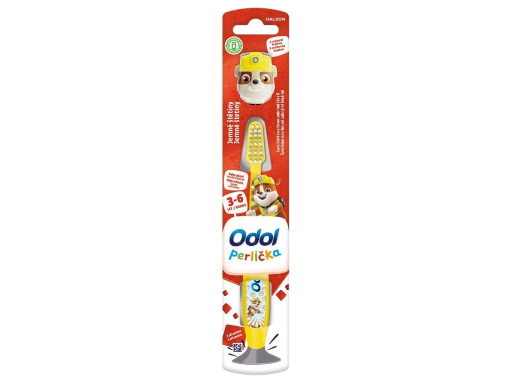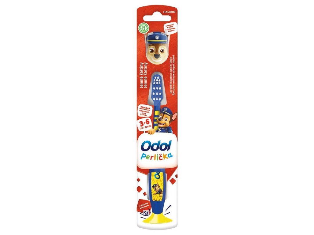 Detská zubná kefka Odol Perlička s motívom obľúbenej Tlapkovej patroly je určená pre deti vo veku 3 až 6 rokov. Vďaka mäkkým štetinám s jemne zaoblenými koncami je šetrná k detským mliečnym zubom a citlivým ďasnám. Ergonomická rukoväť prispôsobená malým detským rukám uľahčuje správnu manipuláciu a robí z čistenia zubov zábavnú a príjemnú aktivitu.