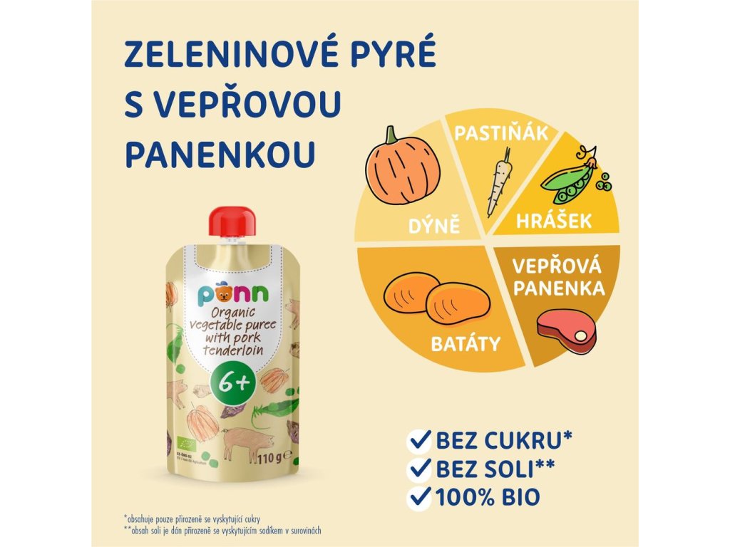 Zloženie: bio sladké zemiaky, voda, bio bravčová panenka (9 %), bio tekvica, bio hrášok, repkový olej, bio paštrnák. Bez lepku.