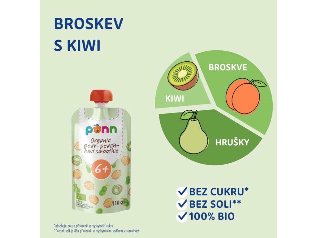 Zloženie: Organické hruškové pyré (55 %), organické broskyňové pyré (35 %), organické pyré z kivi (10 %).