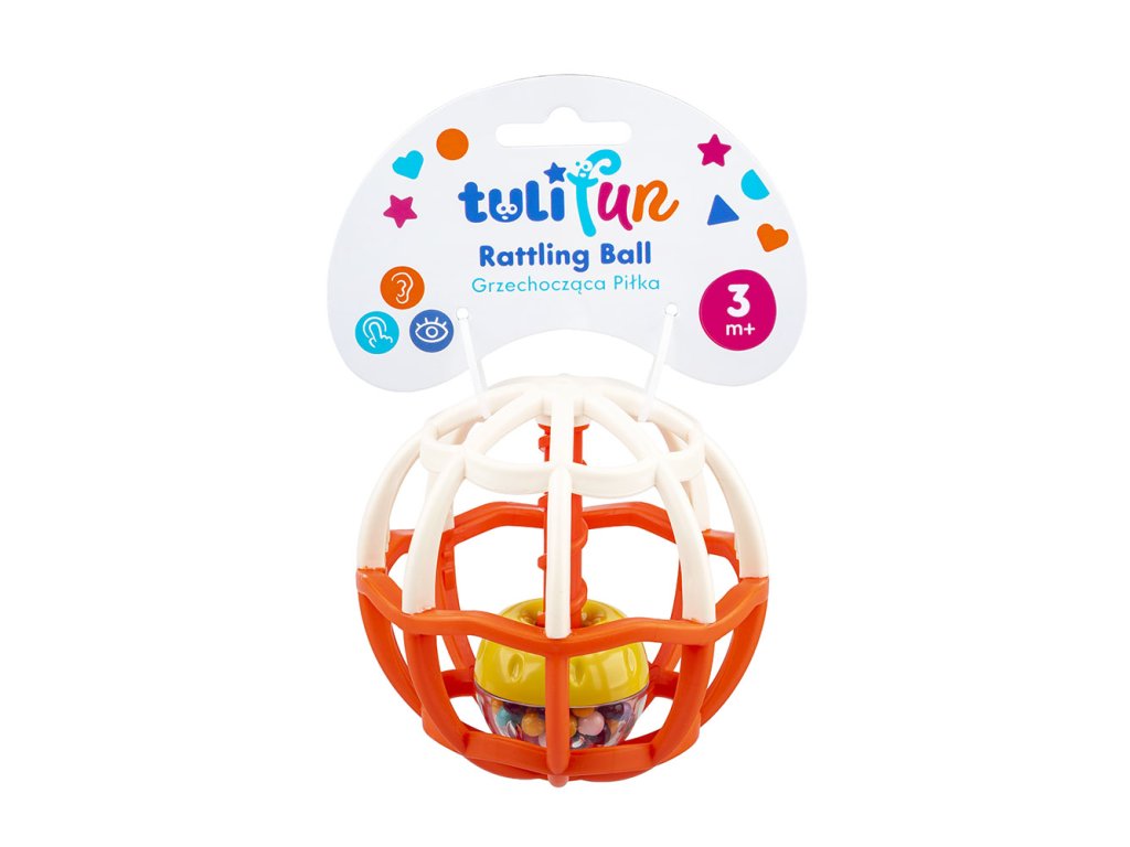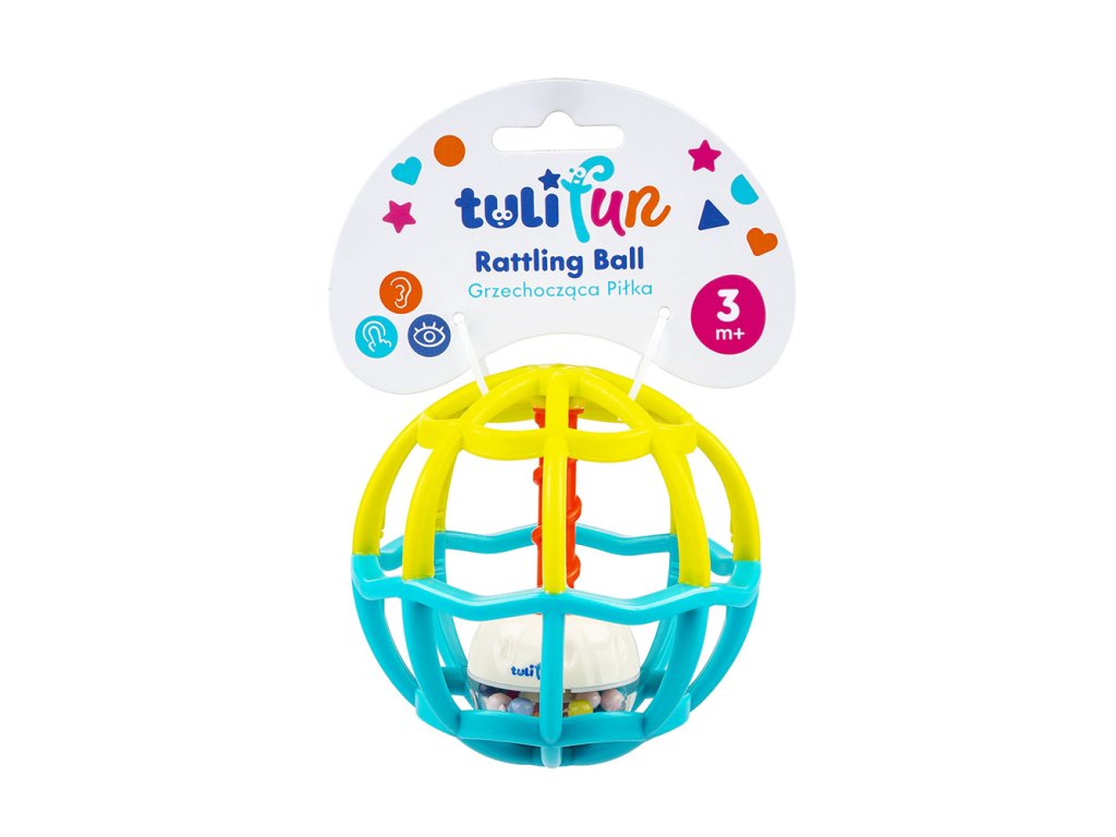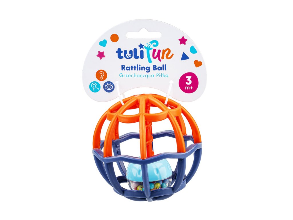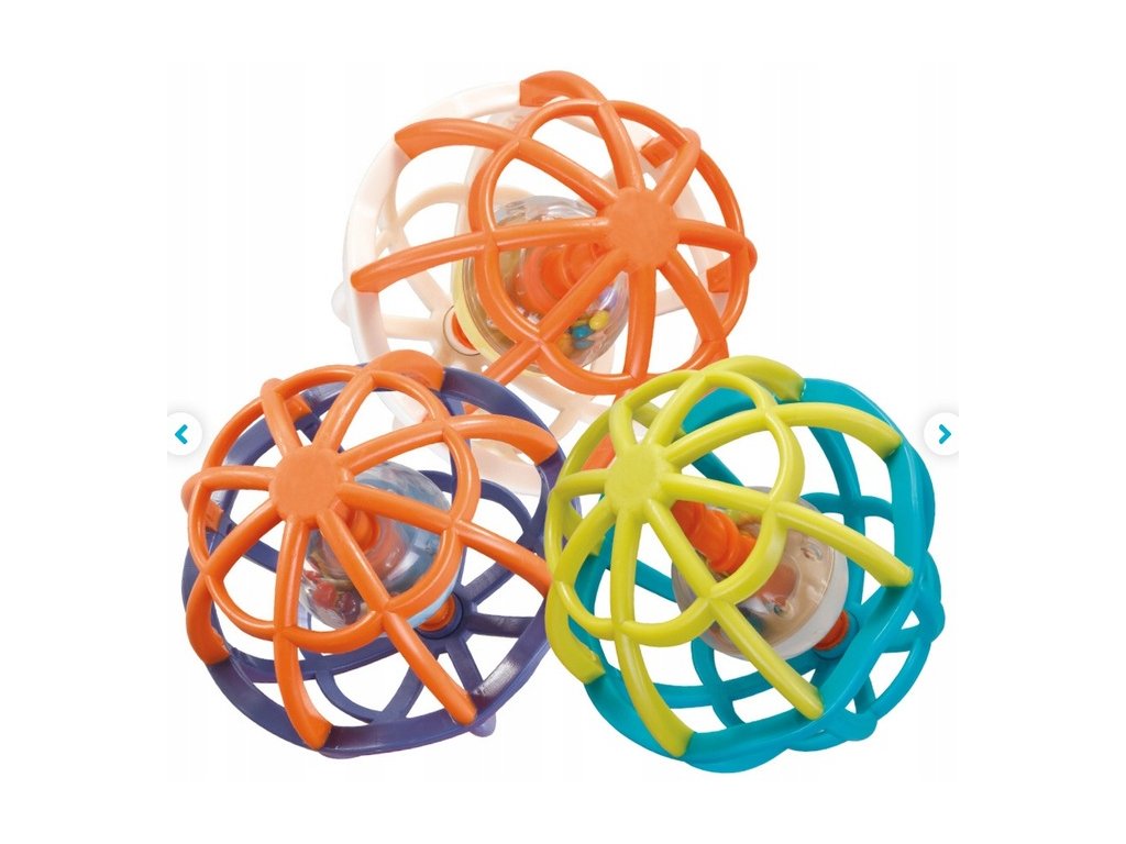Krúti sa a gúľa sa ako blázon! Lopta vo vnútri lopty? Áno! Vo vnútri tejto dômyselnej hrkálky je loptička plná guľôčok. Keď hračku otočíte hore dnom, hrkálka vo vnútri sa posunie nadol a bude sa hravo otáčať. Steny loptičky sú vyrobené z rozmarne zakrivenej mriežky, takže ju malé ručičky ľahko uchopia. Loptička je k dispozícii v troch rôznych farbách, každá sa predáva samostatne.