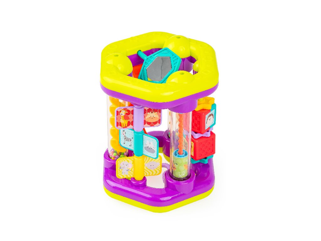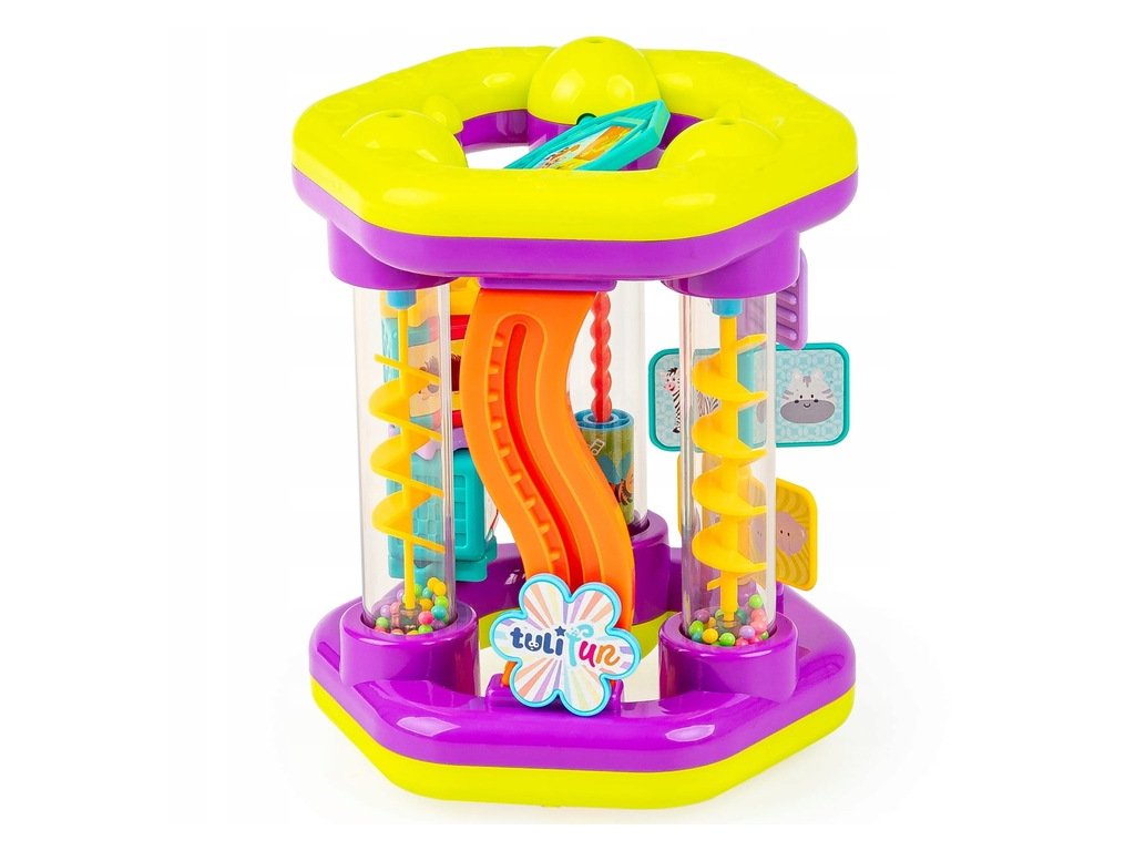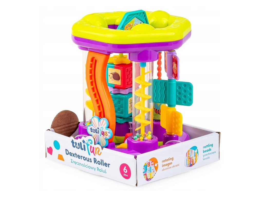Jedna hračka plná množstva aktivít pre najmenších! Každá strana hračky Roluś ponúka inú aktivitu, ktorá zaujme malé ručičky. Nájdete tu kvetinku na pohyb, obrázky zvieratiek na otáčanie, hrkálky, bezpečné zrkadielko a dokonca aj šmýkačku s guľôčkami. Všetky tieto pohyblivé a hrkajúce prvky sú navrhnuté tak, aby stimulovali zmysly vášho dieťaťa a podporovali aktívnu zmyslovú hru!