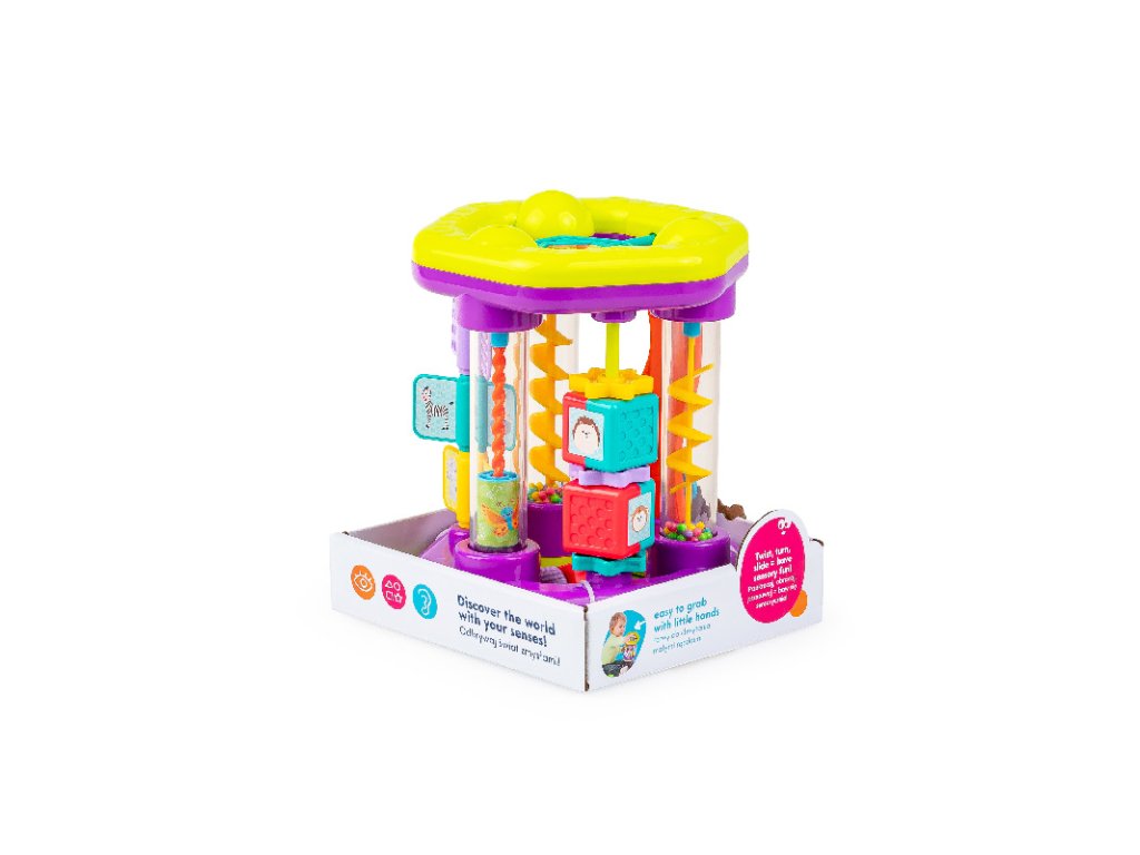 - Hračka, ktorá pri kotúľaní po podlahe povzbudí bábätko k lezeniu a rozmanité prvky a presýpajúce sa guličky prinesú veľa zábavy!