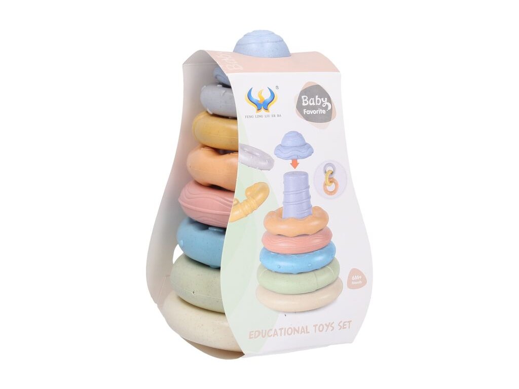 Veža krúžkov na tyčke. Veľkosť 20 cm. Krúžky sa dajú navliekať na tyč, alebo spájať do retiazky.