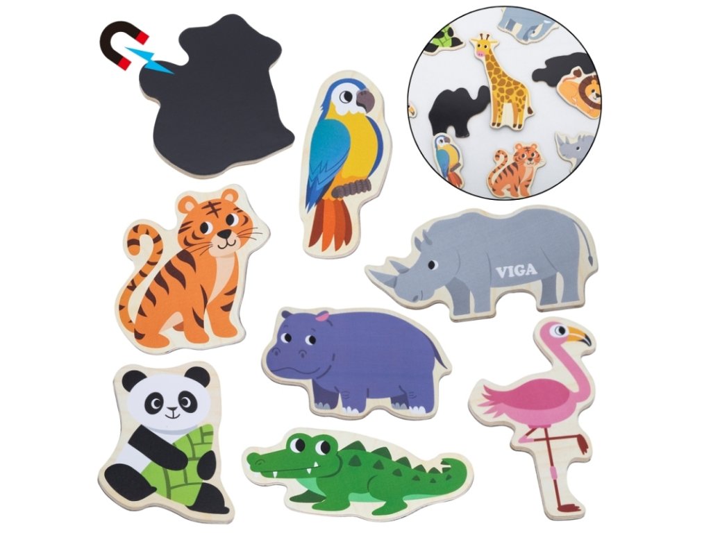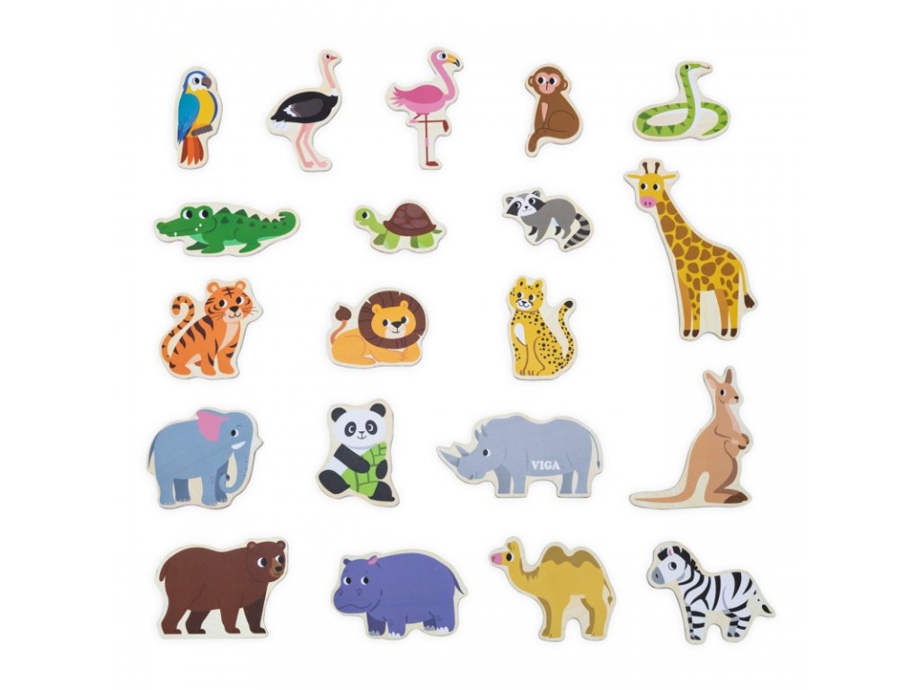 Obsah sady: 20 drevených magnetov s vyobrazením divokých zvierat, vrátane: Žirafa, Nosorožec, Slon, Klokan, Lev, Tiger, Panda, Pštros, Plameniak, Opica, Zebra, Veľblúd, Krokodíl, Had, Želva, Mýval, Medveď, Papagáj (ara), Farebná úložná krabička