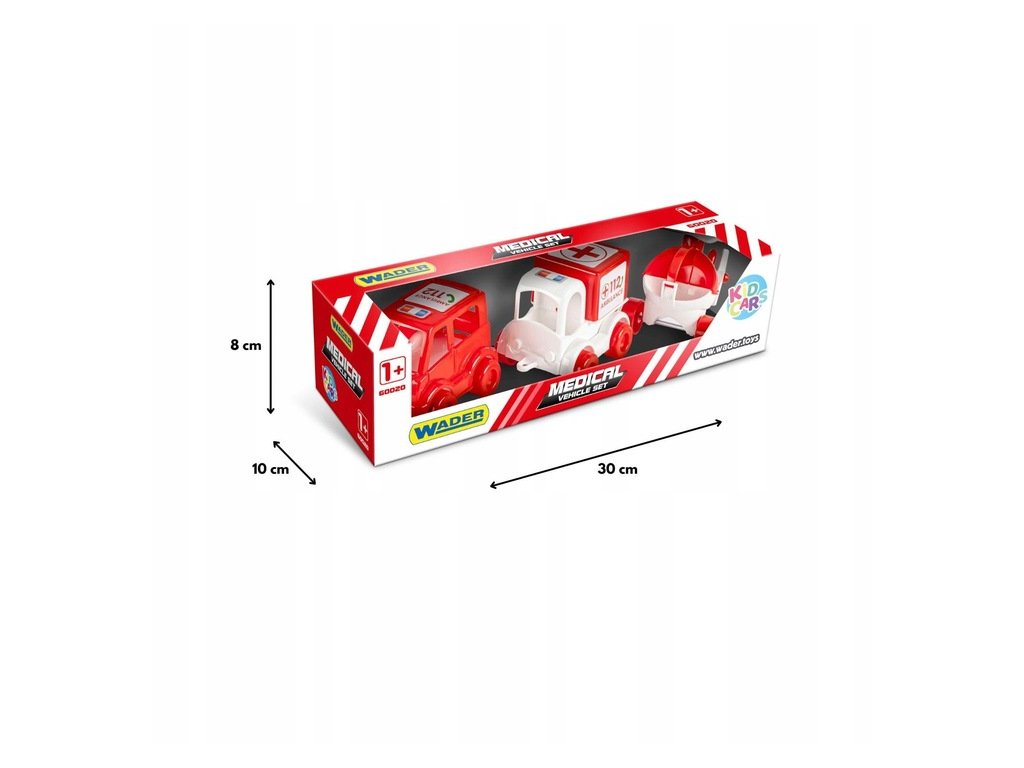 V lekárskom sete nájdeme farebnú sadu 3 autíčok: sanitku, zdravotnícku prepravu a vrtuľník.