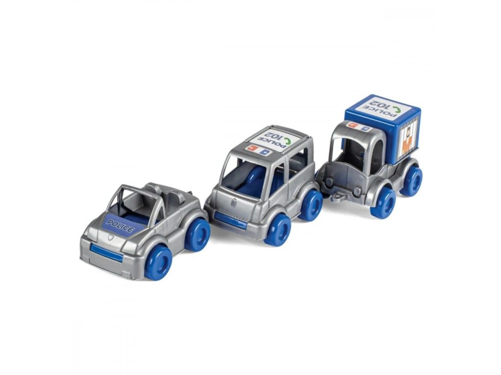 V policajnom sete nájdeme farebnú sadu 3 autíčok: policajné auto, terénne vozidlo a dodávku.