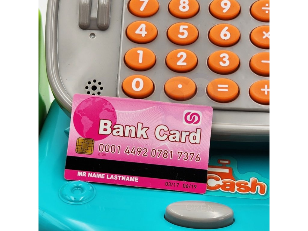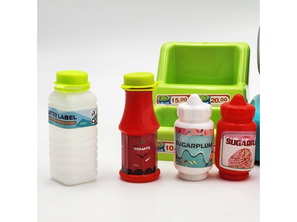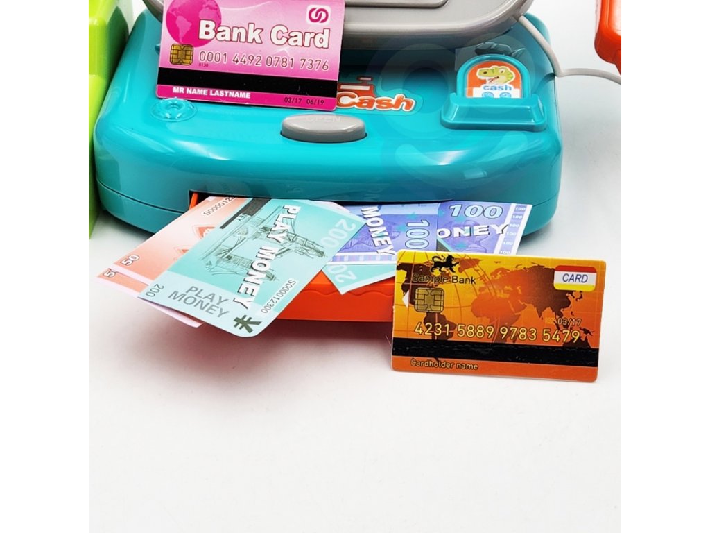 Sada obsahuje: Pokladňa s kalkulačkou a zásuvkou, Interaktívna čítačka čiarových kódov, Dve platobné karty, Hračkové bankovky a mince, 2 police na produkty,atď), Krabička sušienok