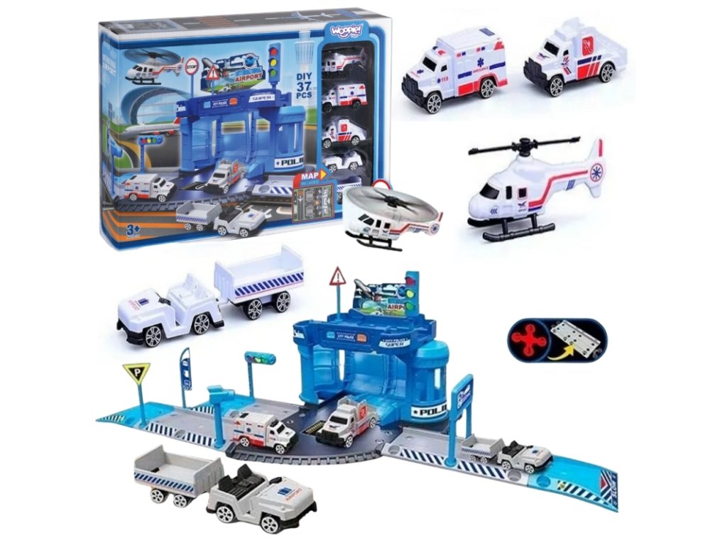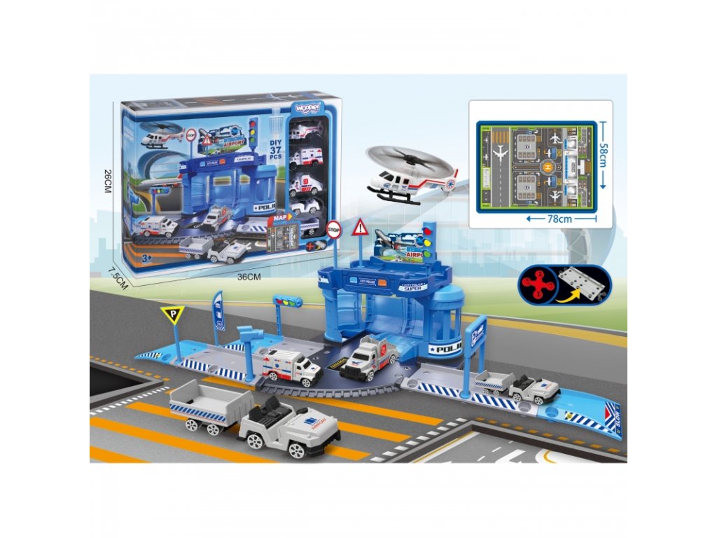 - Súprava obsahuje rôzne vozidlá : policajné auto, vrtuľník, letiskové autá.