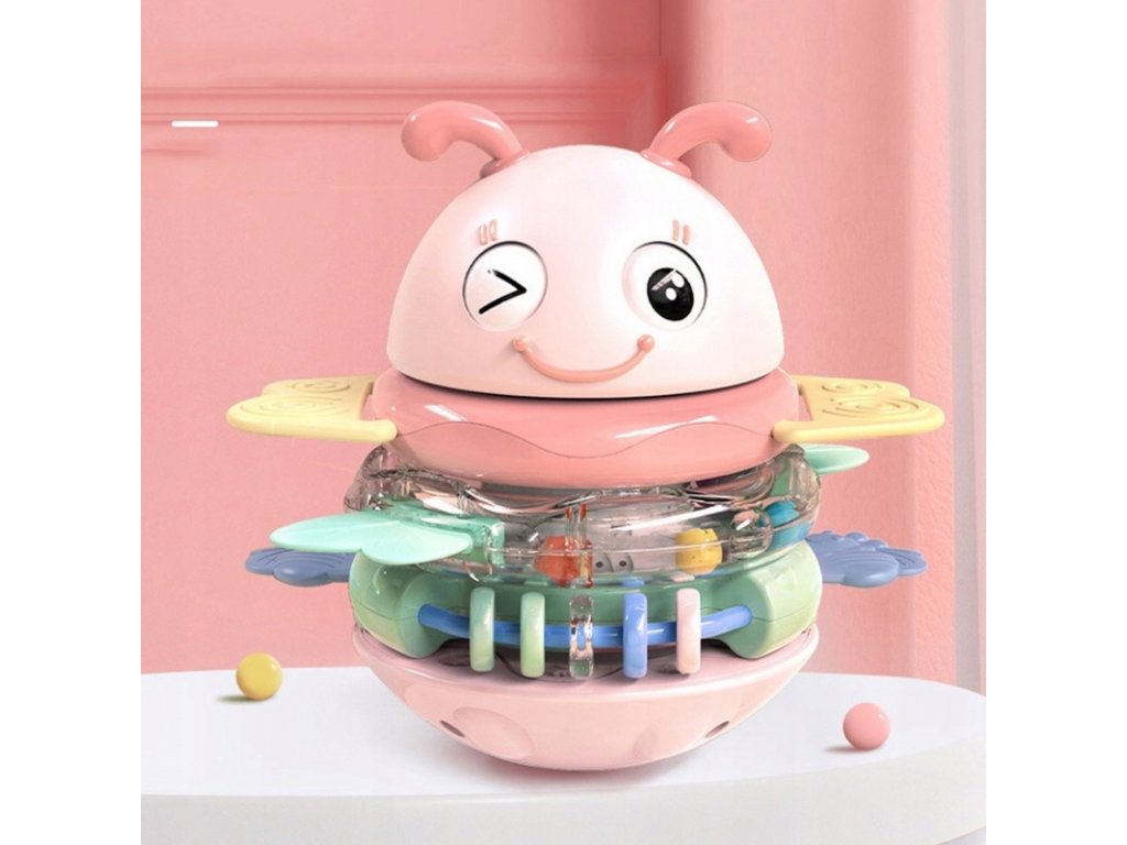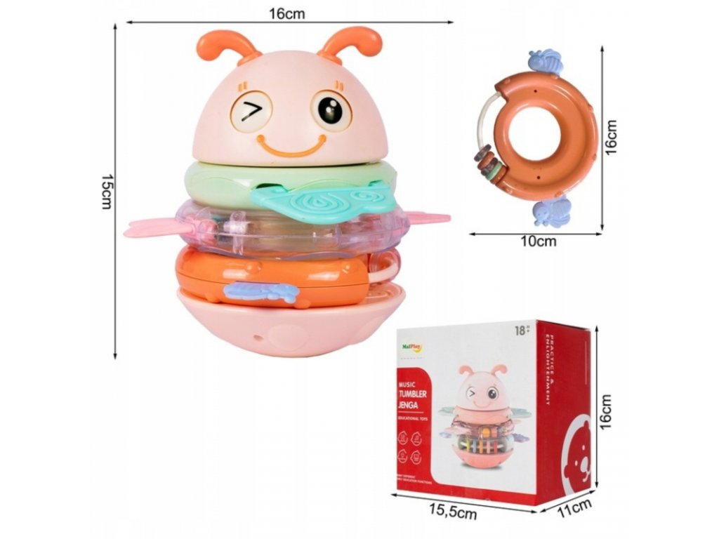 Hrnček Woopie 2 v 1 Blue Bee Tumbler je multifunkčná senzorická hračka , ktorá poteší ako svojou funkčnosťou, tak vzhľadom! Kombinuje hrkálky a hryzátka so zvukovými efektmi a poskytuje vášmu dieťaťu všestrannú hru a podporuje jeho vývoj od prvých mesiacov života. Tri farebné krúžky, ktoré fungujú ako hrkálky aj hryzátka , je možné pripevniť na špeciálny kolíček, ktorý v závislosti od zvoleného režimu prehrá pesničku alebo vydá zábavný zvuk. Očarujúca včelia hlava s pohyblivými očami dotvára vzhľad a vytvára atraktívny tvar, ktorý upúta pozornosť dieťaťa. Táto hračka bola navrhnutá s ohľadom na najmenšie deti . Jemné silikónové výstupky na krúžkoch sú ideálne ako hryzátka , zatiaľ čo bezpečné, zaoblené tvary umožňujú ľahké uchopenie a manipuláciu. Všetky dieliky sú farebné, rozmanité textúry a vhodnej veľkosti, čím stimulujú zmysly, zvedavosť a motorické zručnosti vášho dieťaťa . Vďaka zaoblenej základni sa hračka jemne hojdá s pohybom a nie je ľahké ju prevrátiť! Nie je to len hračka, ale spoločník pre každodenné učenie a rozvoj .