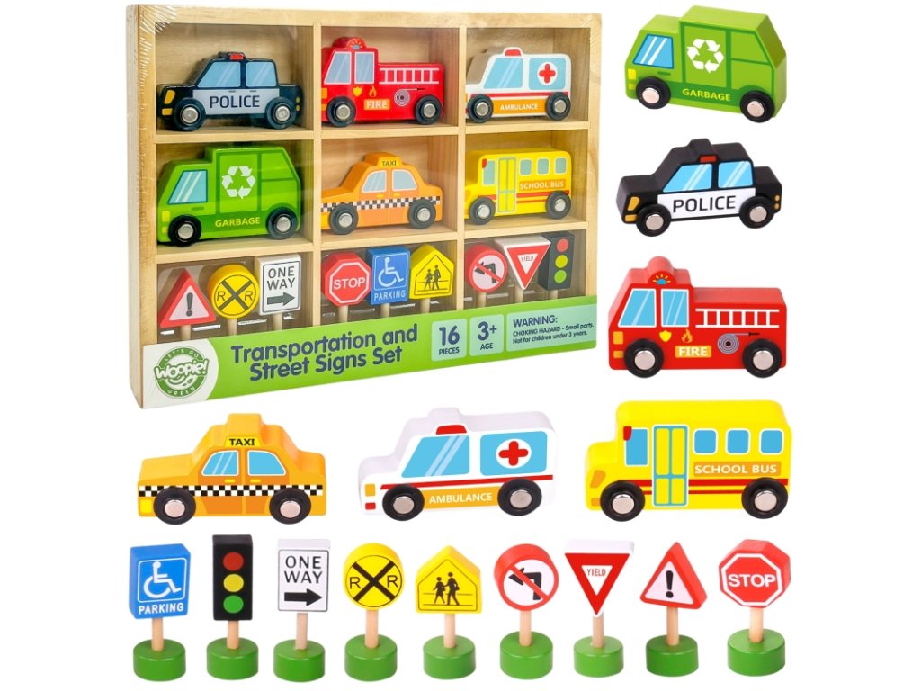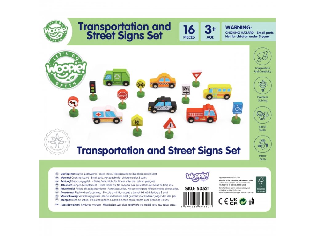 Táto drevená sada od Woopie Green je vynikajúca vzdelávacia pomôcka, ktorá deti hrou zoznamuje s pravidlami cestnej premávky. Sada obsahuje 6 farebných vozidiel a 9 dopravných značiek , ktoré batoľatám pomáhajú naučiť sa základné pravidlá bezpečnosti cestnej premávky. Celá sada je vyrobená z odolného dreva a je ošetrená bezpečnými, netoxickými farbami .