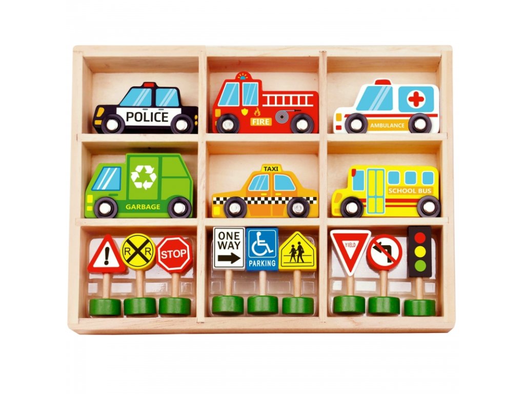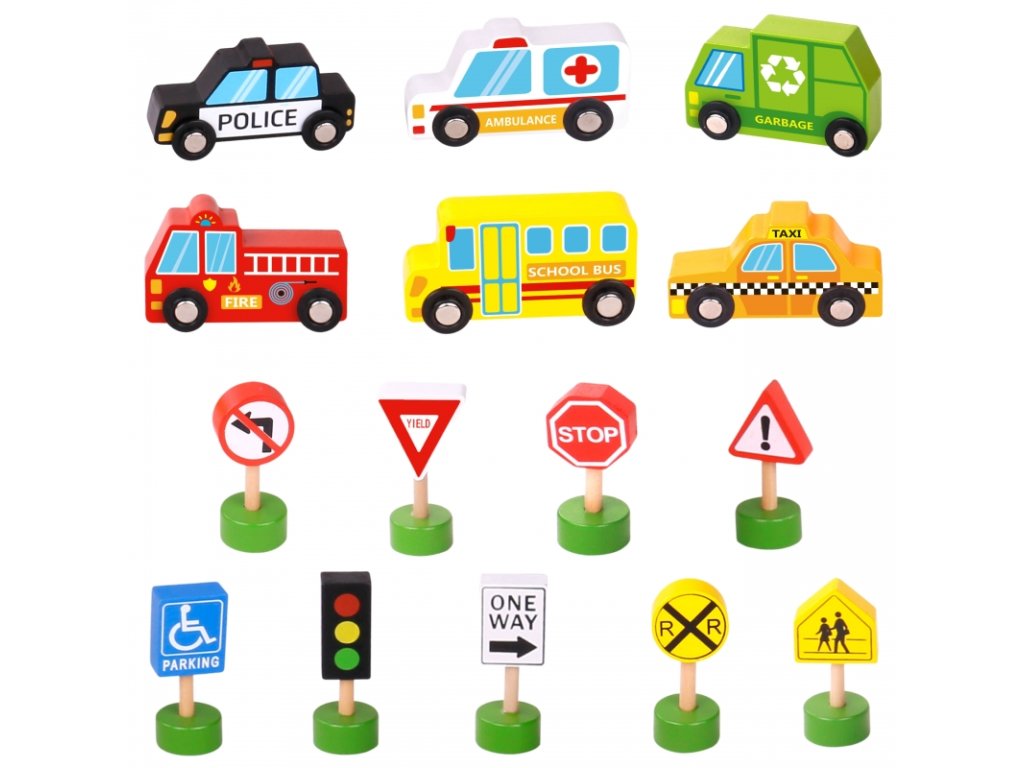 Súprava obsahuje: Sanitka, Hasičský zbor, Taxi, Školský autobus, Policajné auto, Smetiarske auto, Semafory, 8 dopravných značiek