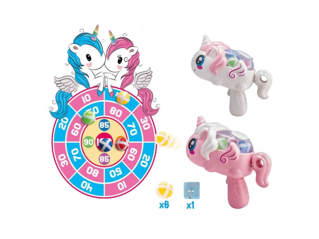 Súprava obsahuje: Vystreľovač loptičiek v tvare jednorožca, Veľká cieľová tabuľa s bodovaním, Guľôčky na suchý zips (6 kusov), Samolepiaci háčik na zavesenie štítu