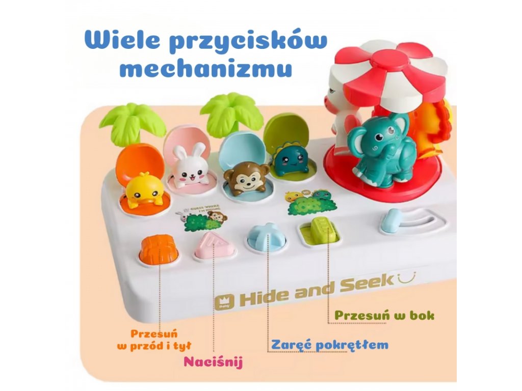 - Farebná, interaktívna „vyskakovacia“ hra - keď stlačíte, otočíte alebo pohnete tlačidlom, zvieratko vyskočí z úkrytu